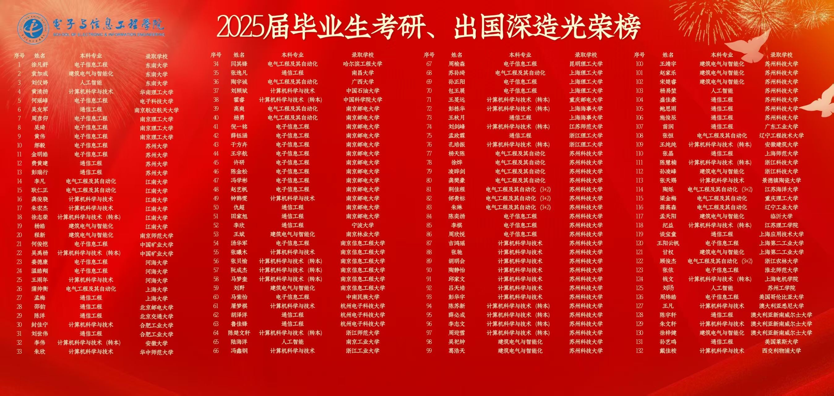 电子学院2025届毕业生考研、出国深造光荣榜