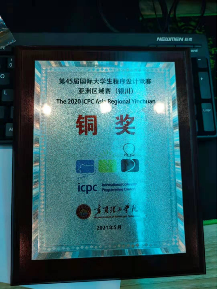2021.05.15日-16日,第45届国际大学生程序设计竞赛亚洲区域赛(银川)在宁夏理工学院成功举行。本次比赛共有245所院校参加、499支队伍参赛。涵盖了北京大学、清华大学等31所985高校,西安电子科技大学等51所211高校。经过五个小时的激烈角逐,由我校电子学院程成博士、奚雪峰博士、陆卫忠老师指导的ACM集训队成员周波(计算机1812),时微淳(计算机2012),黄泱邦(信计2011)斩获铜奖。这是本校在该项赛事上的重要突破。