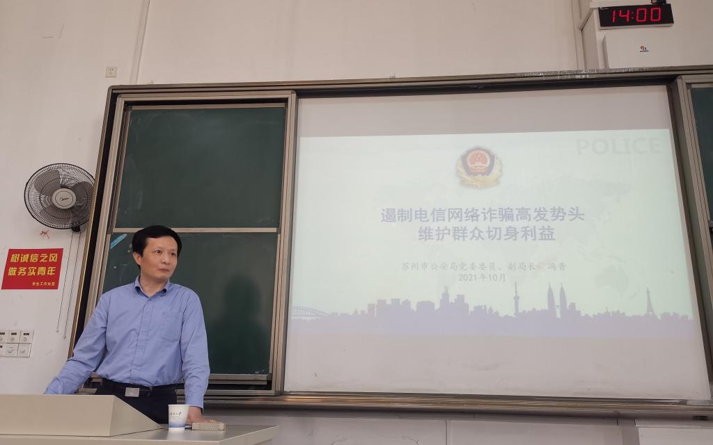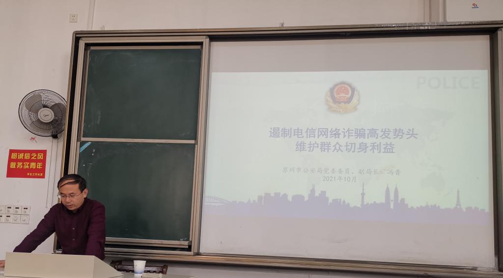 为了响应中共苏州市委宣传部、中共苏州市委组织部、中共苏州市委市级机关工作委员会下发的“关于公布2021年度苏州市在党史学习教育中深入开展‘百名局长百场宣讲’活动安排的通知”,推动全市党史学习教育走深走实,引导广大广大党员干部坚持学史明理、学史增信、学史崇德、学史力行,切实增强“四个意识”、坚定“四个自信”、做到“两个维护”,10月27日下午2点,苏州市公安局党委委员、副局长冯晋走进williamhill英国,为电子学院的广大师生进行了一场题为“遏制电信网络诈骗高发势头 维护群众切身利益”的精彩宣讲。