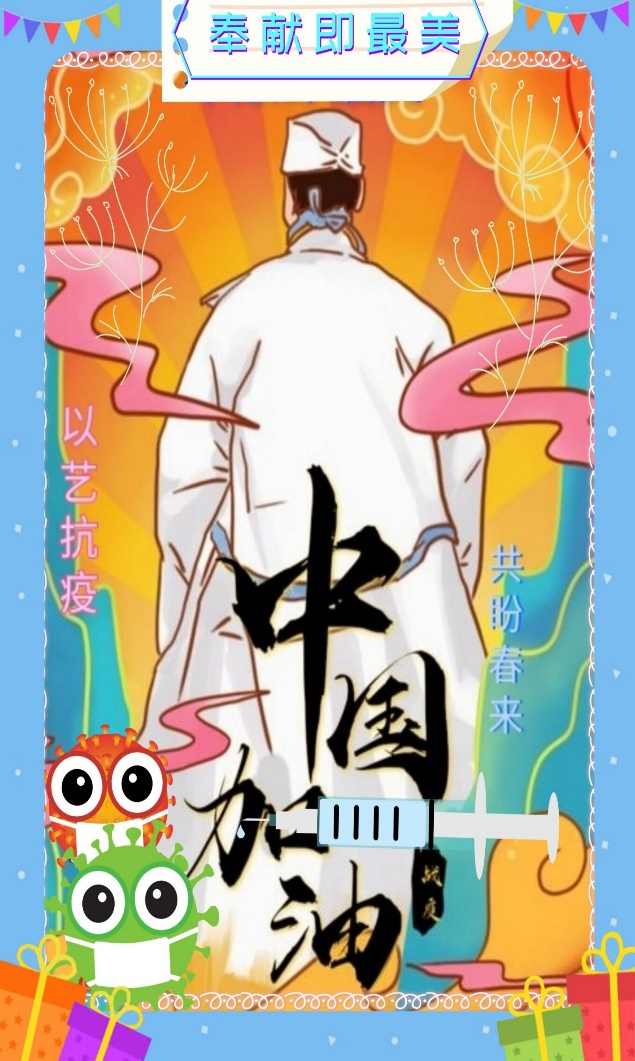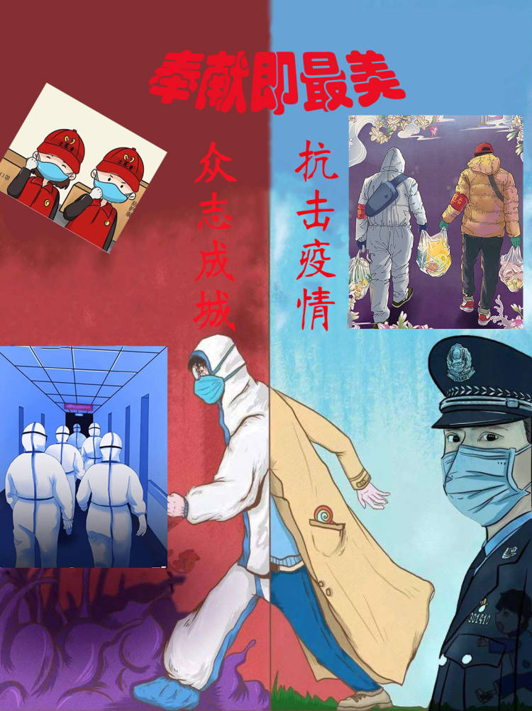 以艺抗疫,同学们用手中的画笔、镜头和铿锵有力的音律,以文学、诗词、音乐、舞蹈、美术、书法、摄影等多种艺术表现形式,创作推出了一大批强信心、暖人心、聚民心的优秀文艺作品,讴歌抗疫一线的党员干部、医护人员、志愿者和人民群众,宣传疫情防控工作中涌现的先进典型和感人事迹。