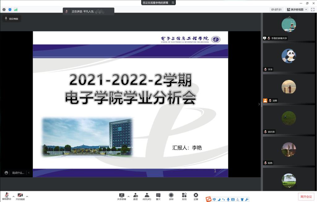 4月13日上午10点,电子学院召开了本学期线上学业分析暨教学质量研讨会。学院党政领导、系部主任、学院督导、教务办、学工办、班主任等45人参加了会议,会议在腾讯会议室进行,由教学院长李泽主持。