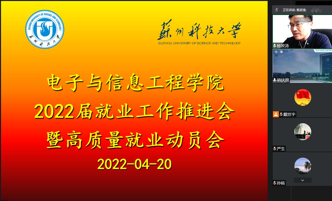 首先,院长胡伏原就今年学院的情况进行了介绍,然后从就业大环境、疫情影响、经济情况等方面对就业形势进行了分析,并提出了几点建议:一是鼓励学生就地就业,苏州疫情严峻,大部分企业暂停招聘,就地就业较为符合当前形势;二是做好帮扶就业,老师、学工多线并举,共同为学生就业保驾护航。学工办严生老师介绍了学院目前的考研、就业落实情况。副书记、副院长杨波涛老师详细介绍了电子学院高质量就业方案。落实学院领导班子、系主任班子、辅导员和班主任等各级成员的责任。除此之外,学院“SPD”中心、学生党员、学生干部也参与进来,全方位、多方面做好就业工作。做到“全员参与、人人有责”,对学生的就业提供细致的服务。