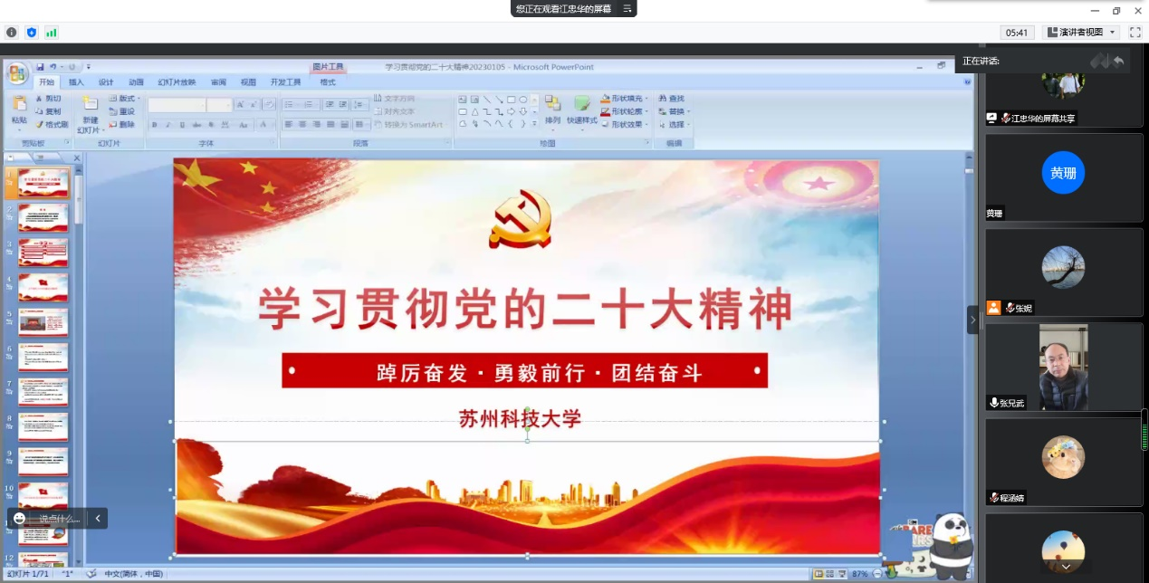 为全面学习把握落实党的二十大精神,近日,电子学院线上开展“学习贯彻党的二十大精神”主题宣讲,会议由电子学院党委书记张兄武主持,党的二十大精神学校宣讲团成员、商学院党委书记江忠华主讲,电子学院全体教职工参加。