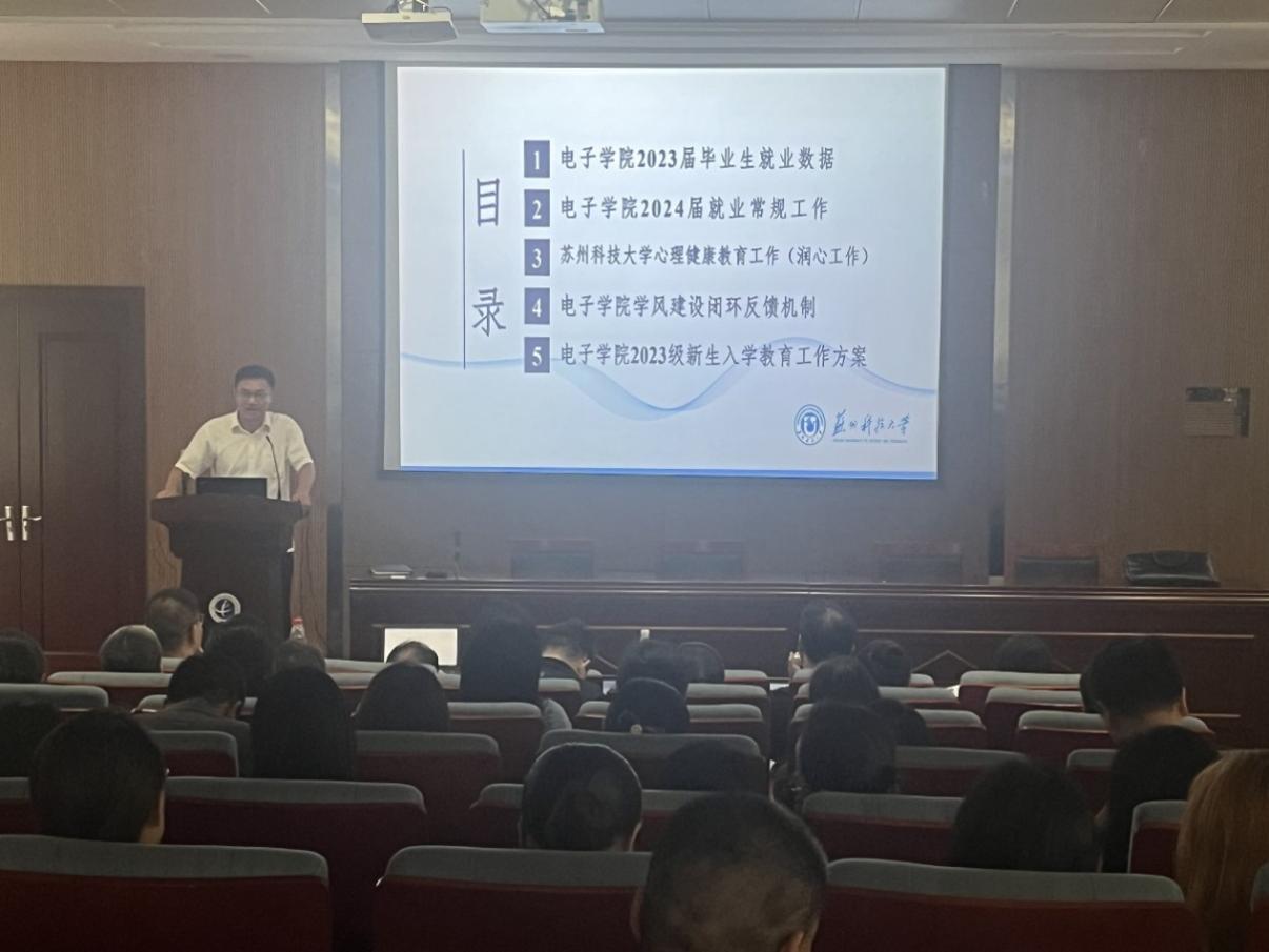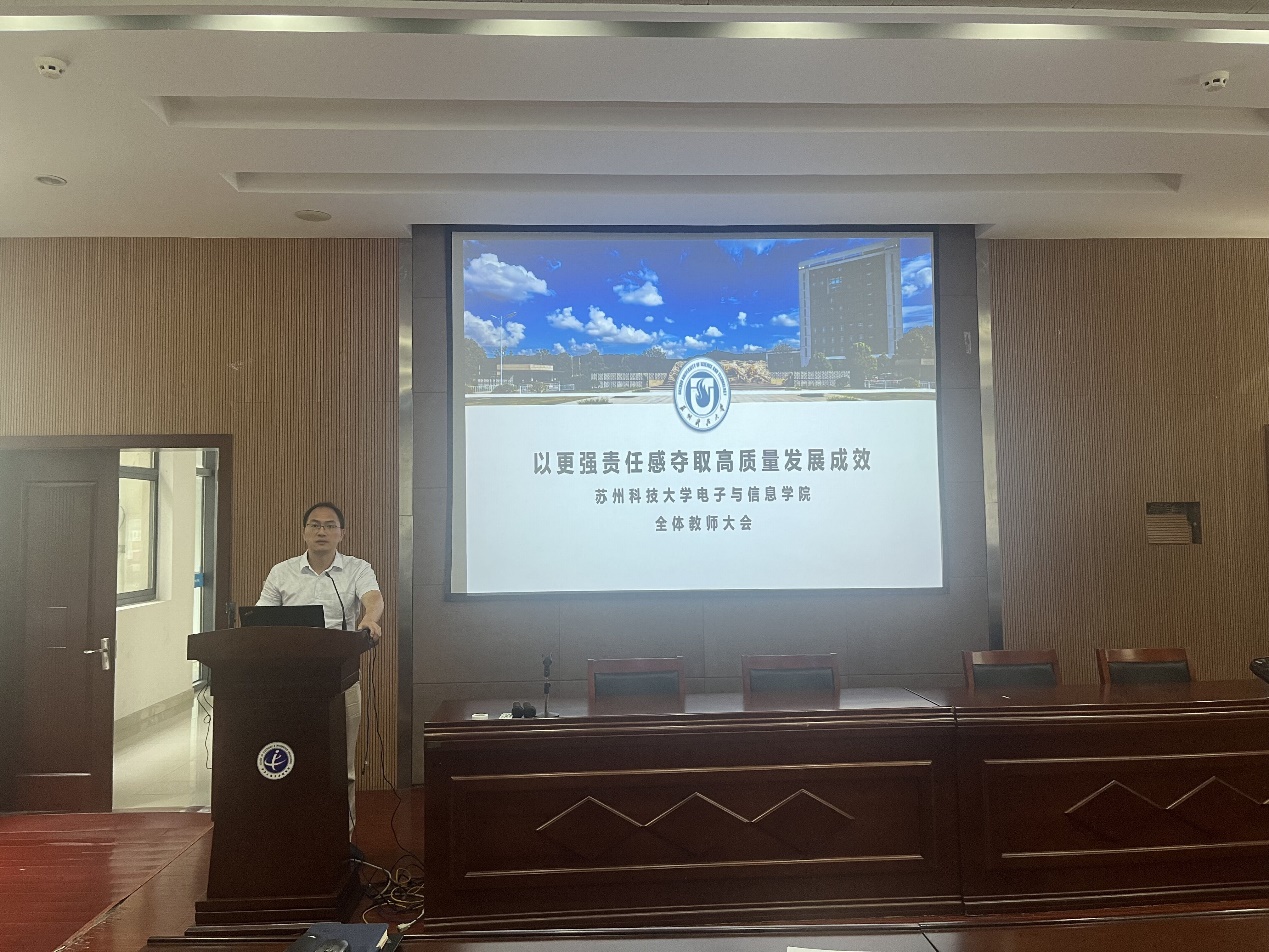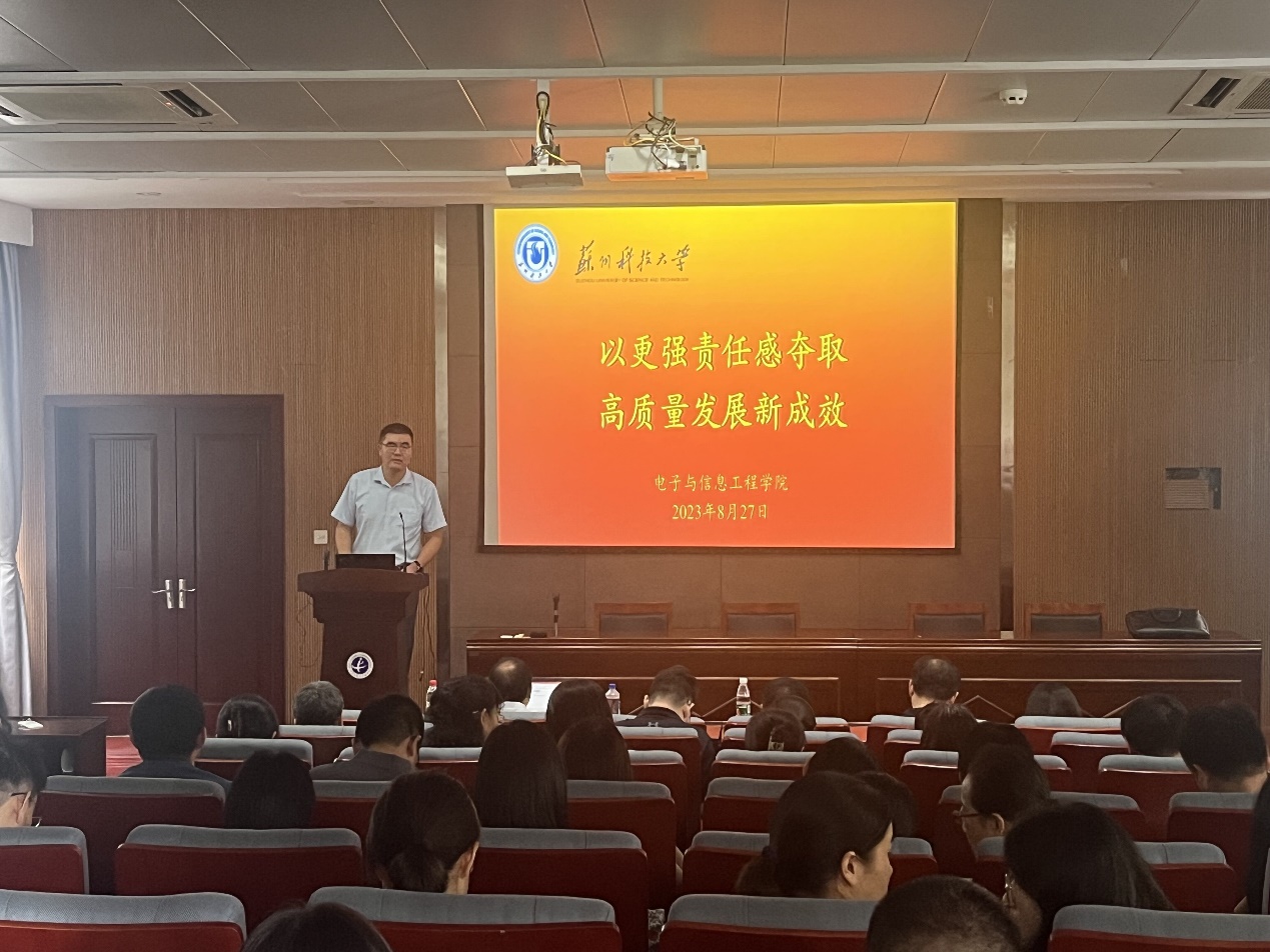 院长胡伏原以《以更强责任感夺取高质量发展新成效》为主题,说明了学院位置与培养定位,专业、学科、科研等工作的主要情况及存在问题,布置本学期学院整体工作及后续的重点工作,胡伏原强调将进一步加强学院专业学科等方面建设,将科研融入苏州发展,不断推动学院高质量发展取得新成效!