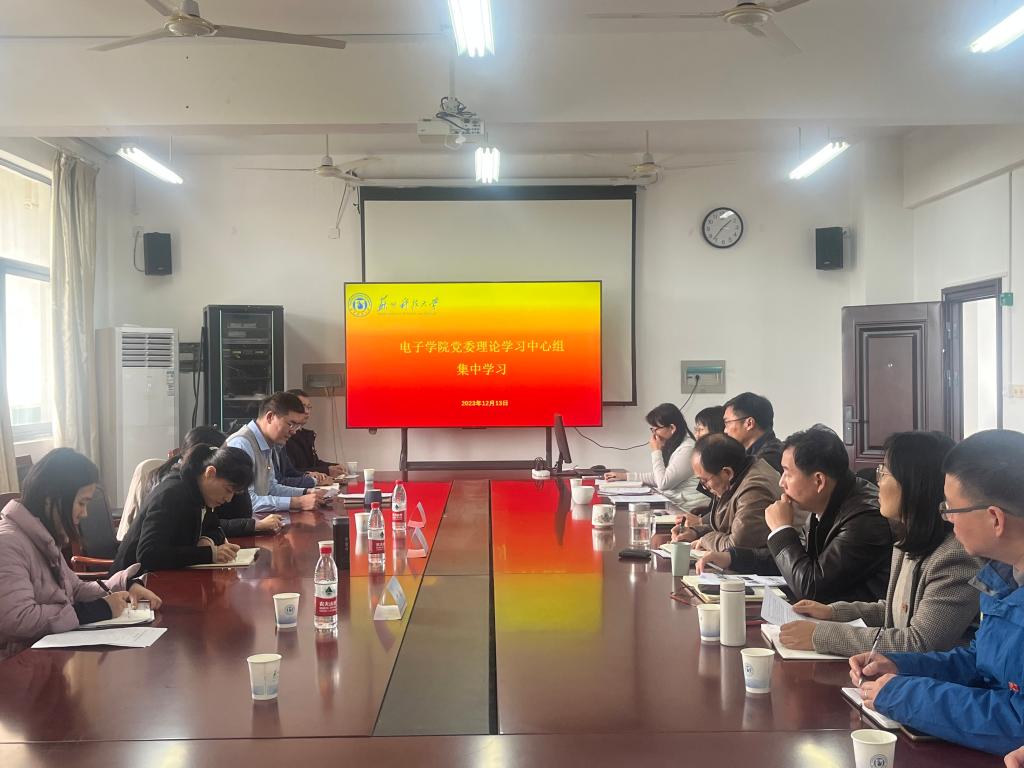 12月13日下午,电子与信息工程学院党委理论学习中心组在电子楼A303会议室召开专题学习会,深入学习领会党的二十届二中全会精神。校长顾菊平,校长办公室副主任张媛,学习秘书叶恬一行到学院巡学旁听,电子学院党委理论学习中心组成员出席会议,院长胡伏原列席,会议由学院党委书记章鸣主持。