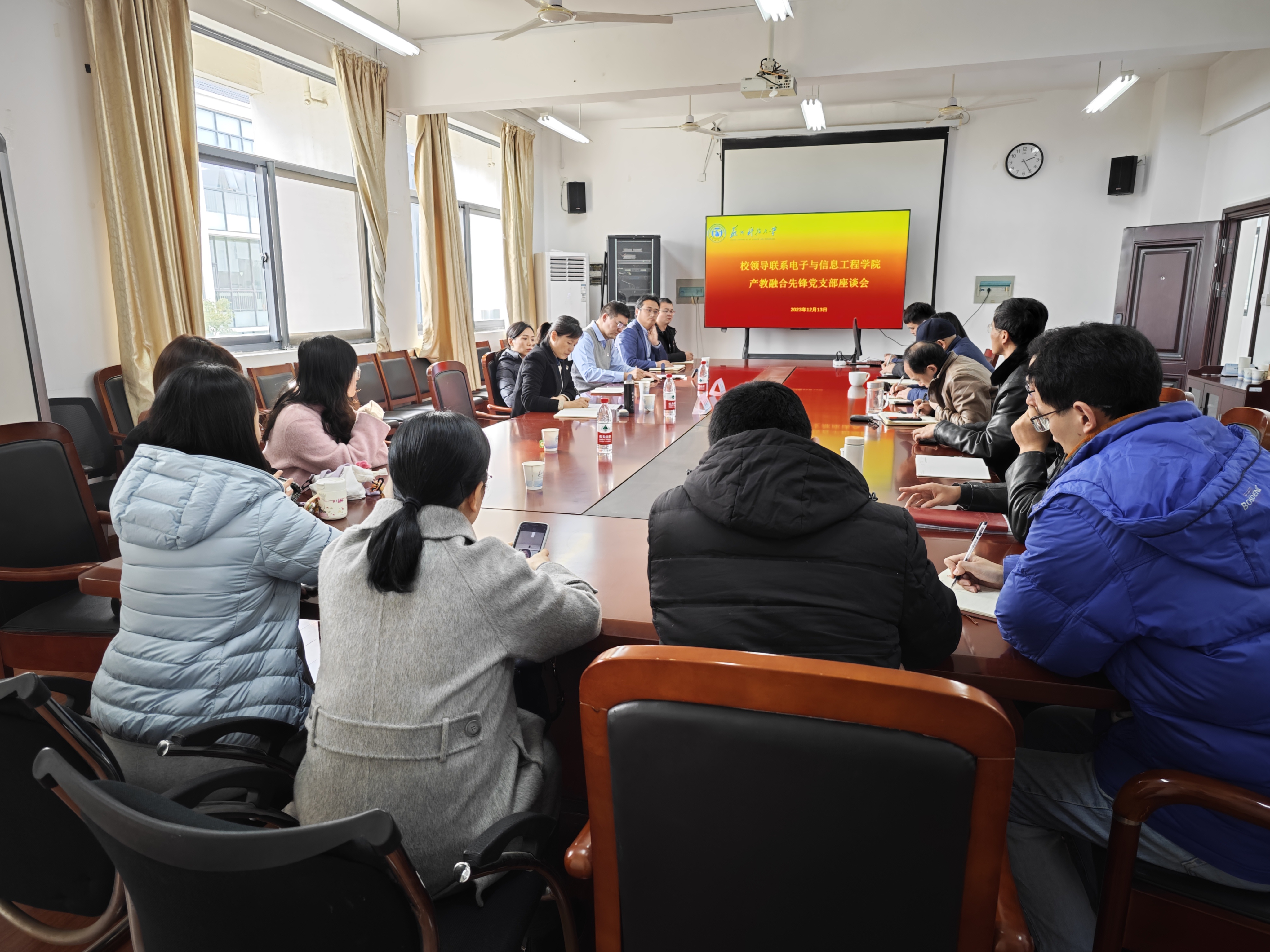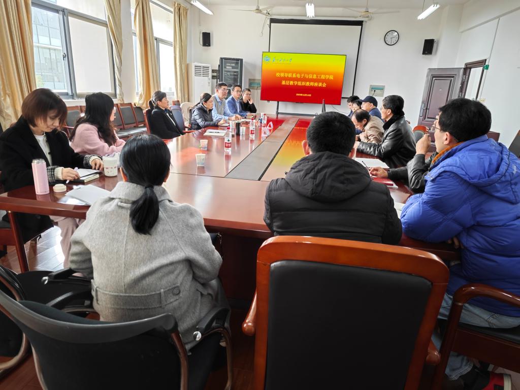 接着顾菊平校长参加了电子学院基层教学组织座谈活动。学院党政班子、各系主任及与教学组织中青年教师代表参与了座谈。