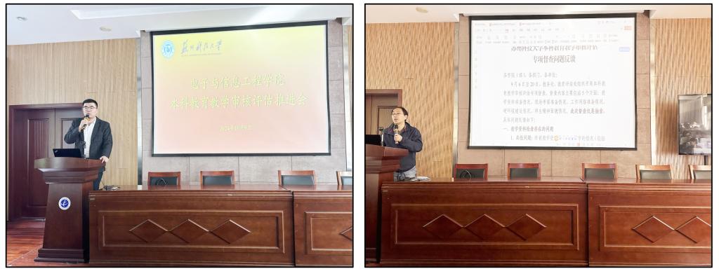 学院院长胡伏原传达了9月28日学校本科教育教学审核评估推进会精神,重点介绍了专项督查和专家预诊断反馈的问题,同时希望各位老师始终以学生为中心,巧妙融入思政教育元素,精心策划每一堂课,打造独具特色的课程内容,以更饱满的热情和更高的标准迎接本科教育教学审核评估;学院党委书记章鸣强调了本次本科教育教学审核评估工作对学院和学校的重要性,要求全院老师务必统一思想、明确目标,以高度的责任心完成审核评估工作。