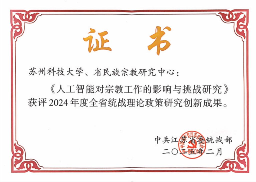 近日,2025年全省统战部长会议在南京召开,会议通报了30篇2024年度全省统战理论政策研究创新成果获奖篇目。在校党委统战部和省民族宗教研究中心指导下,我院党委书记章鸣作为主要负责人的研究成果《人工智能对宗教工作的影响与挑战研究》成功入选。