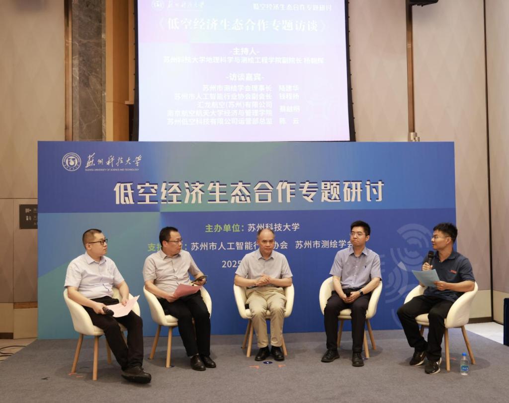 圆桌访谈环节,我校杨朝辉教授、苏州市测绘学会理事长陆建华、苏州市人工智能行业协会副会长钱程扬、南京航空航天大学蔡啟明教授、苏州低空科技有限公司运营部主管陈云4位嘉宾与主持人一起,围绕低空经济的生态构建、技术挑战与产业机遇展开深入探讨,现场气氛热烈。
