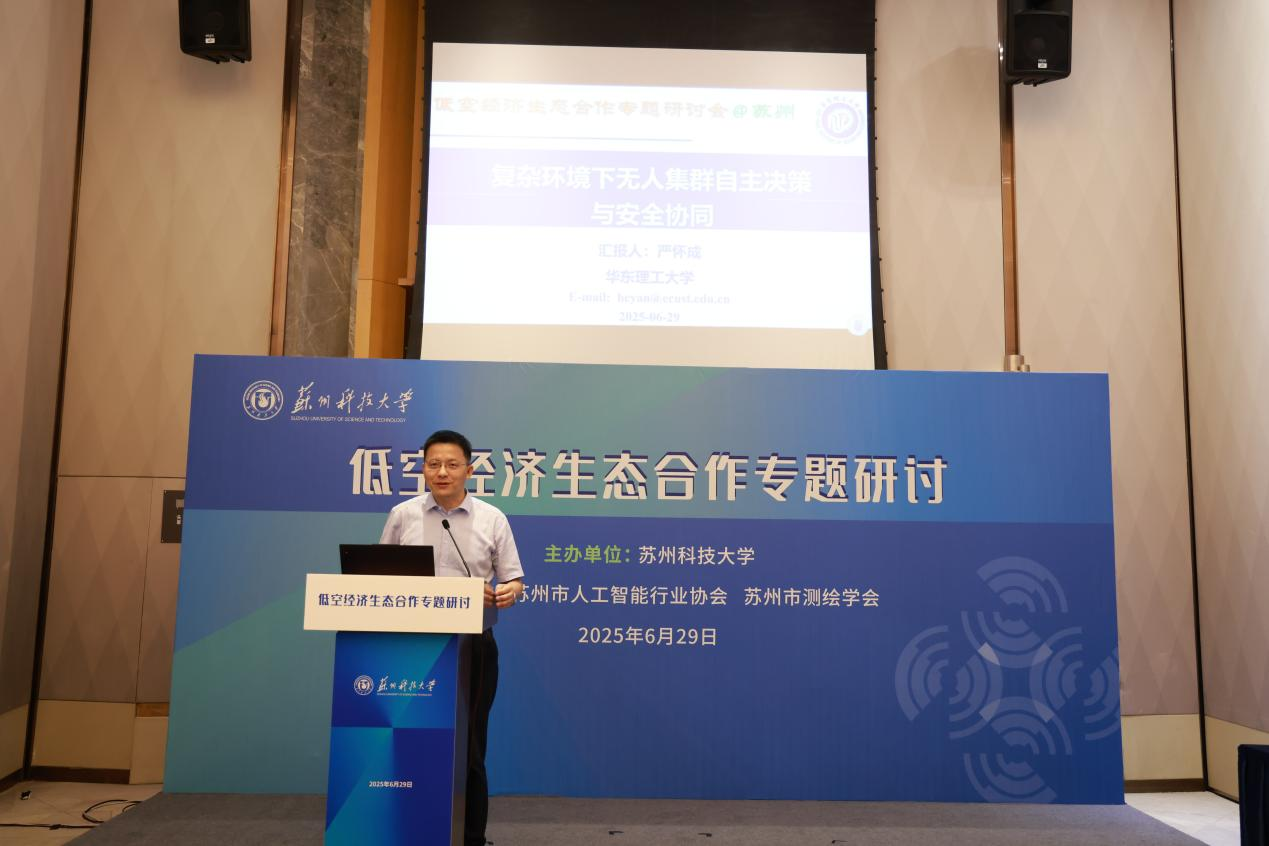 大会报告环节,国家万人计划领军人才华东理工大学严怀成教授以“复杂环境下无人集群自主决策与安全协同”为题,探讨面向动态复杂环境,无人集群在非合作目标编队跟踪包围、噪声干扰下机动目标追捕以及杂乱环境内安全引导与导航方面的最新研究成果,并对未来研究方向进行展望,为低空经济的技术创新提供了新思路。
