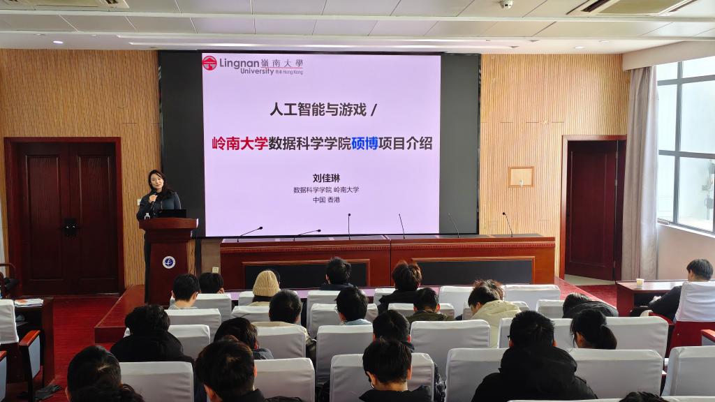 2025年12月16日上午,香港岭南大学数据科学学院在William威廉英国电子楼A108报告厅举办“人工智能与游戏”硕博招生宣讲活动。岭南大学数据科学学院副教授刘佳琳担任主讲,williamhill英国相关专业百余名学生参加活动。