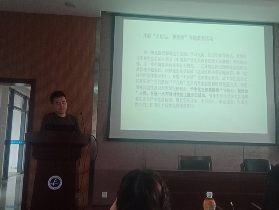 其次,周老师向同志们介绍了“毕业生党员集中教育管理月”的相关活动,分别是:开展“守初心、担使命”专题教育活动、认真做好毕业生党员信息登记工作、组织开展毕业生党员档案检查工作、认真做好党员组织关系接转工作、定期开展毕业生党员回访工作及开展“重温入党誓词,深情寄语母校”活动。