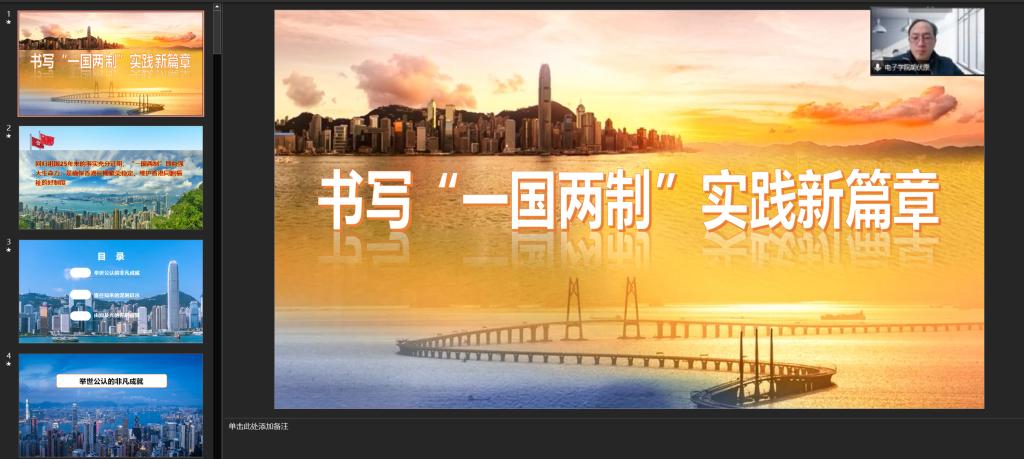 为进一步提高大学生的思想政治水平,2022年12月6日,我院院长胡伏原以“书写‘一国两制’实践新篇章”为题,为20级计算机专业的学生上了一堂精彩的形势与政策课。