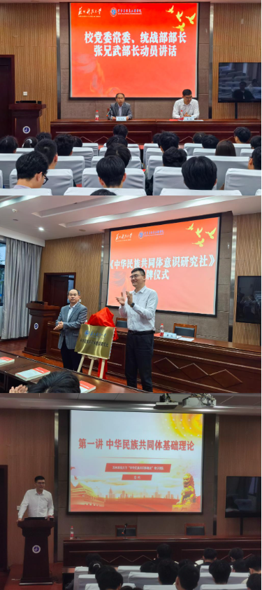 张兄武在开课动员讲话中强调,各族学生要坚定信念有方向,将自己的个人追求与国家发展紧密联系在一起;要守护团结有发展,做民族团结的模范践行者;要勇于担当有责任,为实现中华民族伟大复兴的中国梦贡献自己的青春力量。张兄武和章鸣共同为“中华民族共同体意识研究社”学生社团揭牌。