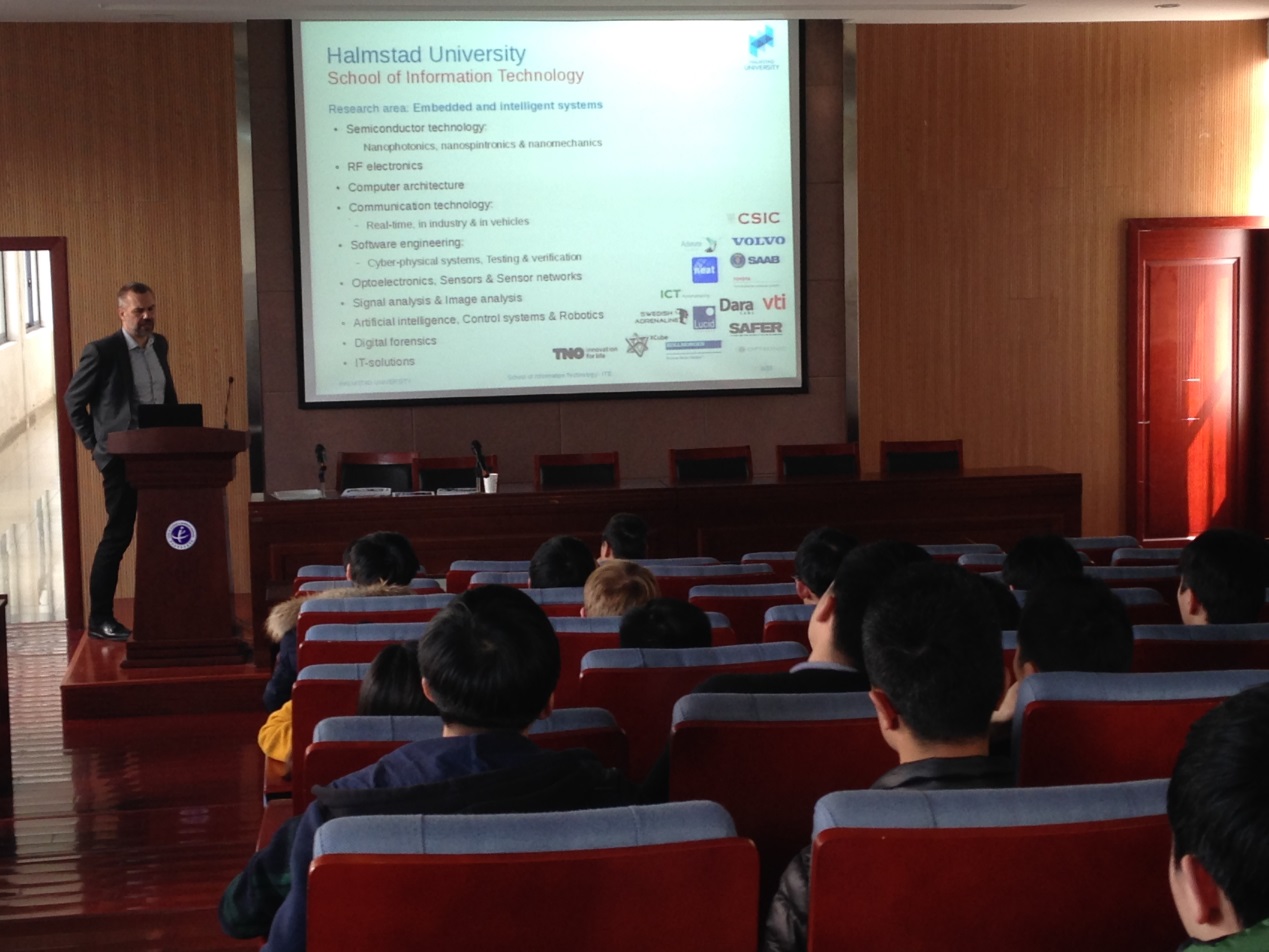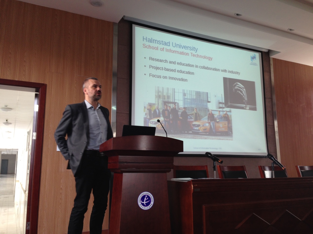 瑞典Halmstad大学Mikael感谢我院的热情接待,并介绍了Halmstad大学在信息类学科建设以及国际合作等方面的宝贵经验;同时,给电子学院学生介绍了暑期合作的课程安排、双硕士学位和本科交流的课程设置等内容,并诚挚邀请我院访问瑞典Halmstad大学,加强两校的进一步了解,促进两校的合作与交流。