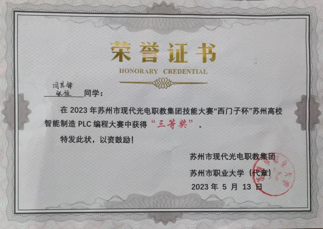在提升个人能力的同时,他也十分注重团队协作能力的培养。大二下学期,他与同学组队,参加“西门子”杯中国智能制造挑战赛。面临陌生的PLC,他与小组成员紧密合作,在老师的指导下,学习了PLC的编程方法,理解了PLC的工作原理。经过漫长难熬的编程与调试阶段,程序不断优化,评价程序优劣的某项关键评价指标从最初的390左右上升到480左右。后来在正式比赛中,稳定发挥,获得华东二赛区一等奖的荣誉。