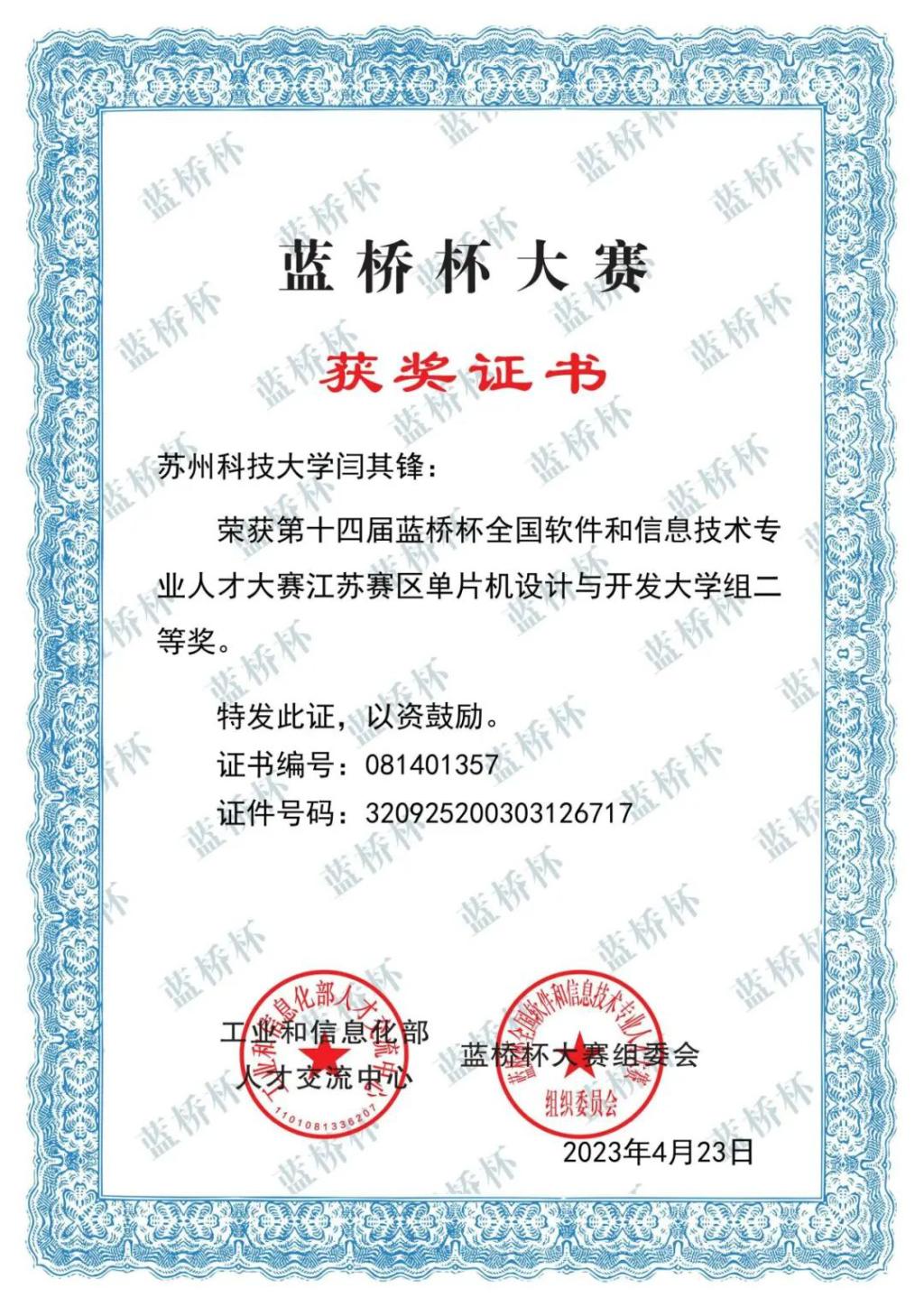 勇于尝试和努力学习是闫其锋大学生活的鲜明风格。他积极参加学科竞赛,他认为参加竞赛一方面可以接触到专业相关的新兴事物,精进自己的专业技能;另一方面也可以达到拓宽知识面开阔眼界的目的。在大二上学期时,他了解到第二年的三月份有微处理器相关的学科竞赛,出于兴趣,他在寒假从零开始,通过网络学习、向老师提问等方式自主学习比赛的相关知识,在第二年的比赛中,顺利的完成了大赛要求的全部功能,最后获得“蓝桥杯”全国信息技术人才大赛江苏赛区二等奖的荣誉。