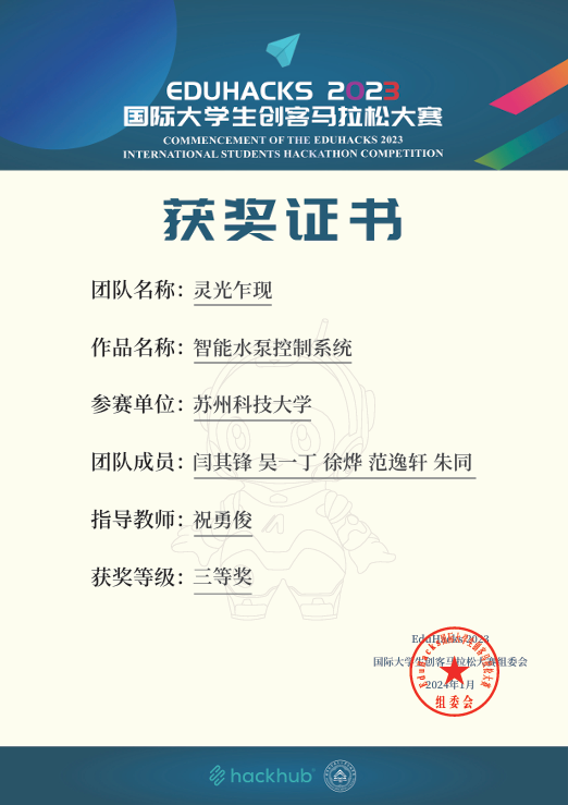 他重视自身创新能力的培养,经常与同学一起探讨问题,在交流的过程中与其他同学紧密合作,互帮互助,在老师的指导下将富有创意的想法落实到实践上。在大三寒假时他与团队成员一起参加国际大学生创客马拉松大赛,并获得了决赛三等奖的成绩。