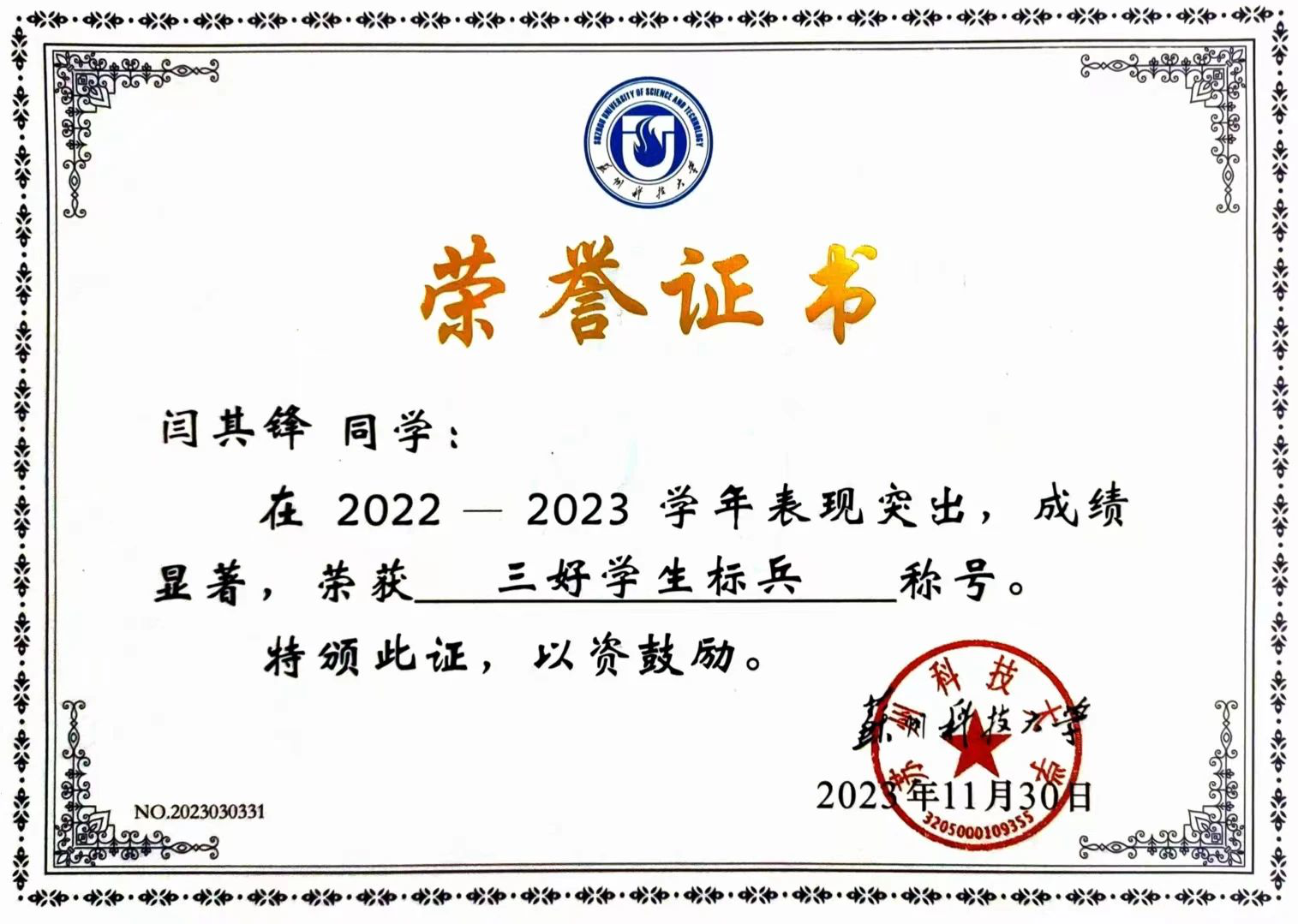 为学之实,固在践履。苟徒知而不行,诚与不学无异。服务社会是一种精神也是一种责任,能够赋予青春别样的色彩。闫其锋认为大学生应该积极的投身社会实践,利用自己的特长与技能服务社会。所以他在做好专业学习之余,积极参加志愿服务。在寒暑假期间走访苏州革命博物馆、新四军纪念馆等红色教育基地进行党史学习。在大二寒假期间,他参加了大学生云支教志愿服务。服务期间,他认真的解答受助对象的问题,精心的准备每一条授课视频,在活动结束后受到学生家长的好评。在日常生活中,他始终保持着“勿以恶小而为之,勿以善小而不为”的作风,积极弘扬良好的道德风尚。