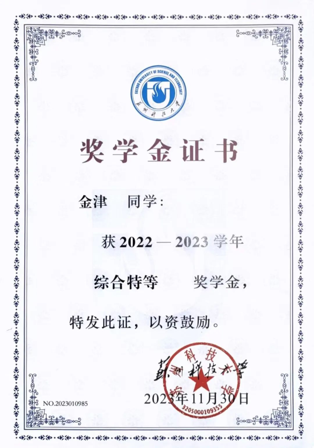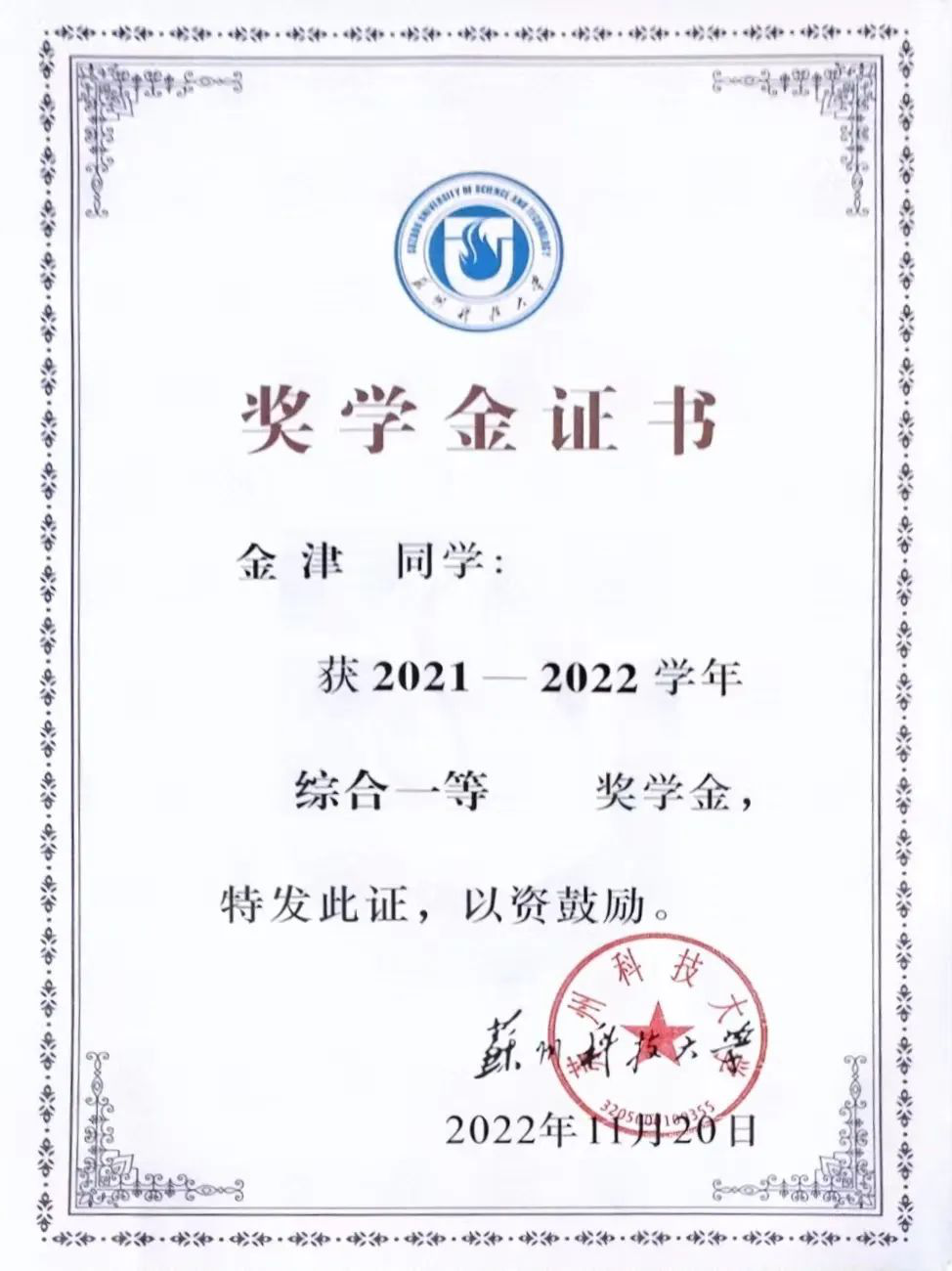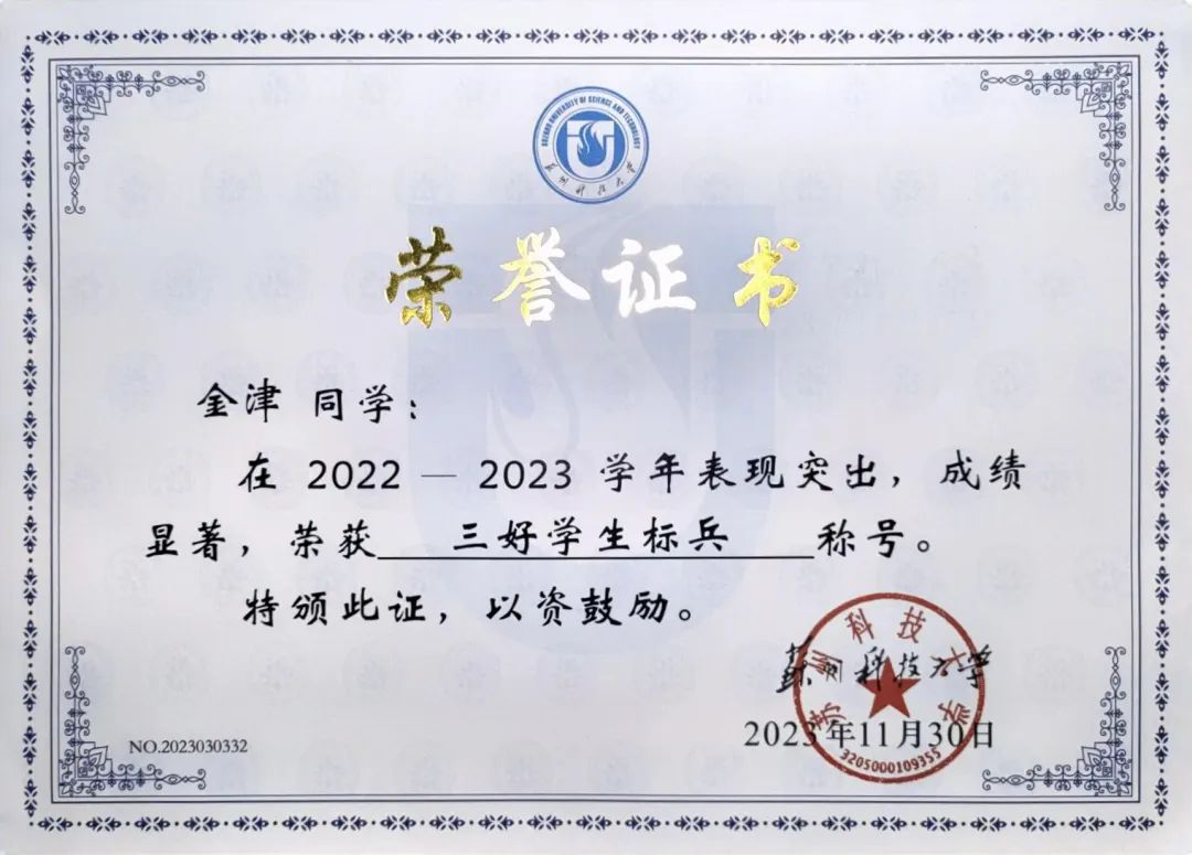 自入学以来,金津就深知学习是大学阶段的第一要务,每一门课程都被她视作探索兴趣的宝贵契机,在课堂上,她紧跟教学思路,积极思考,在课后,她仔细梳理知识脉络,理解深层逻辑,并在导师的悉心指导下,阅读前沿领域文章。修学储能,先博后渊,这两年多金津同学一次性通过大学英语四六级考试,专业成绩始终位列前茅,平均学分绩点3.8,获校特等奖学金、一等奖学金,连续两年获“校三号学生标兵”荣誉称号。