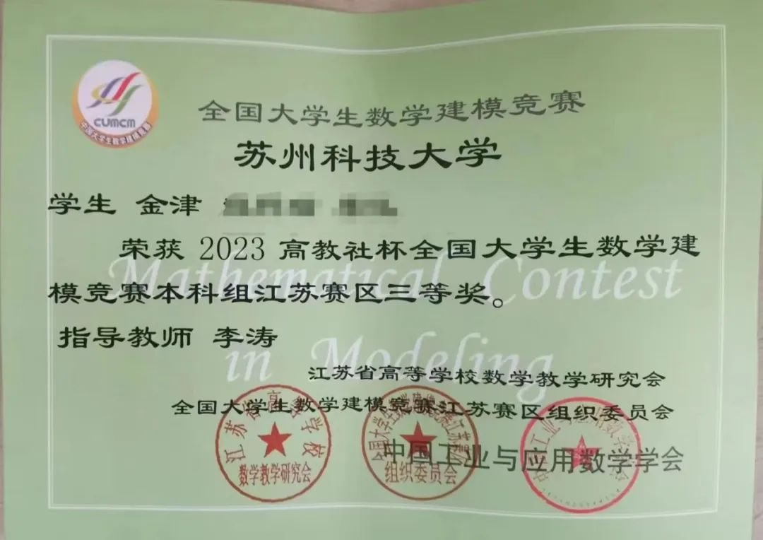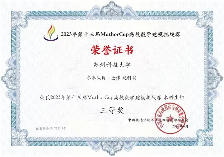 “知其意,悟其理,守其则,践其行”,书本中的知识终究是前人的经验,而脚下的才是自己的世界。知识与实践息息相关,除了必要的实验、实训,她乐于为自己抓住更多实操机会,在暑期参加数学建模培训期间,她常在实验室挑灯夜战,只为将自己负责的部分做到最好,对每个实际建模问题给出完美的解答。最终,在团队共同努力下,获第十三届MathorCup高校数学建模挑战赛本科生组三等奖、2023年中国大学生数学建模竞赛省级三等奖。