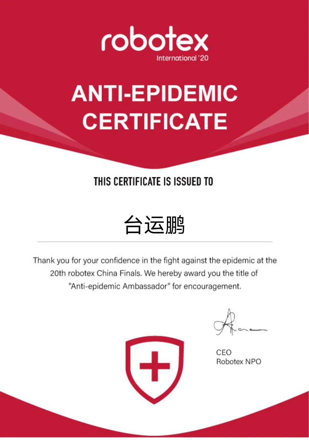 台运鹏说:“分享是一件快乐的事情,每个人应将自我融入集体。在我看来,开展志愿服务就是一种快乐的分享,是将自己融入集体的最好方式。”在学校中,他多次参与迎新等志愿活动,将爱心传递下去,并努力在志愿服务的过程中淬炼自己,展现新时代青年风采。目前作为一名联合国在役志愿者,他发挥自己特长,开展翻译等志愿服务工作。他还曾在第20届亚洲区世界机器人大赛总决赛中担任志愿者,布置场地、搬运物资,接待外国来客,随处可见他忙碌的身影。