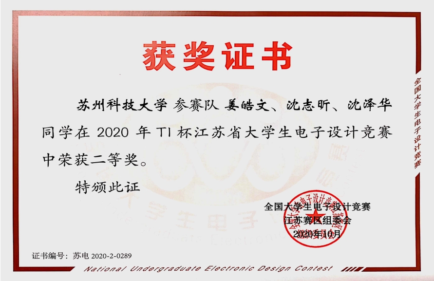 2020年10月荣获Tl杯江苏省大学生电子设计竞赛二等奖