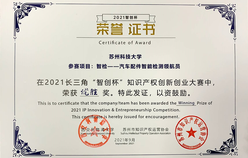 2021年九月在长三角“智创杯”知识产权创业大赛中,荣获优胜奖